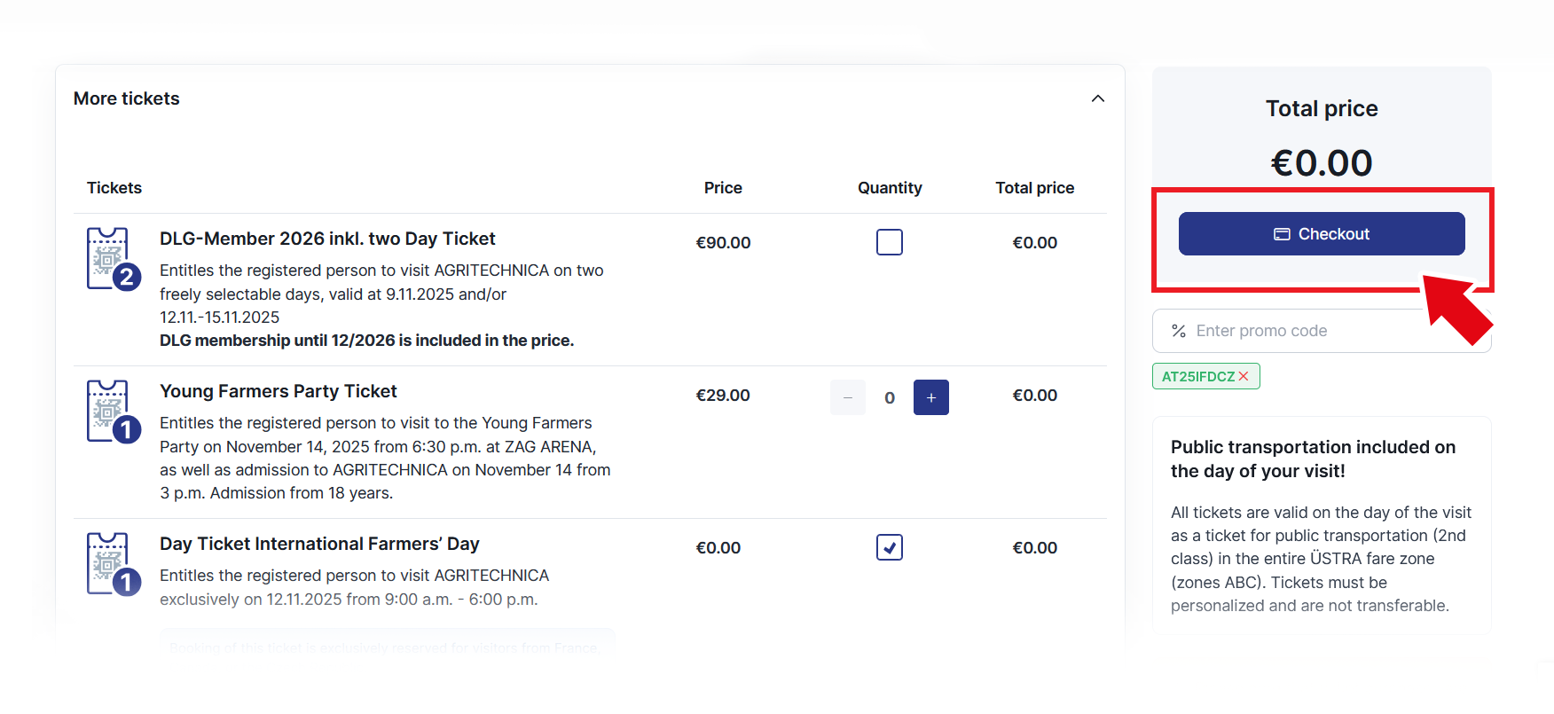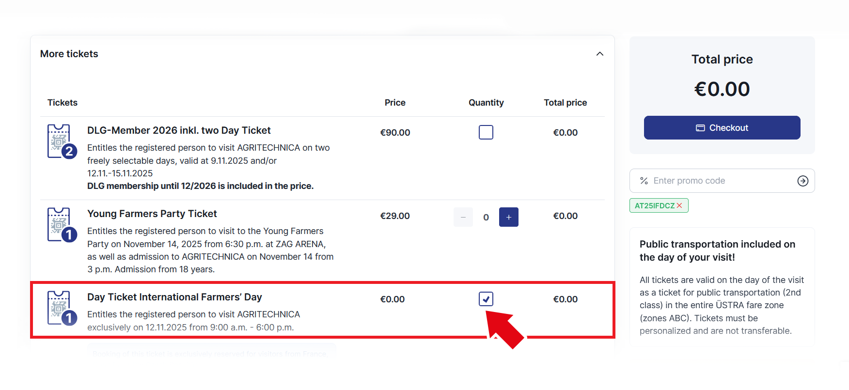 3. V nabídce lístku se objeví vstupenka „Day Ticket International Farmers’ Day“ – zaškrtněte políčko.
